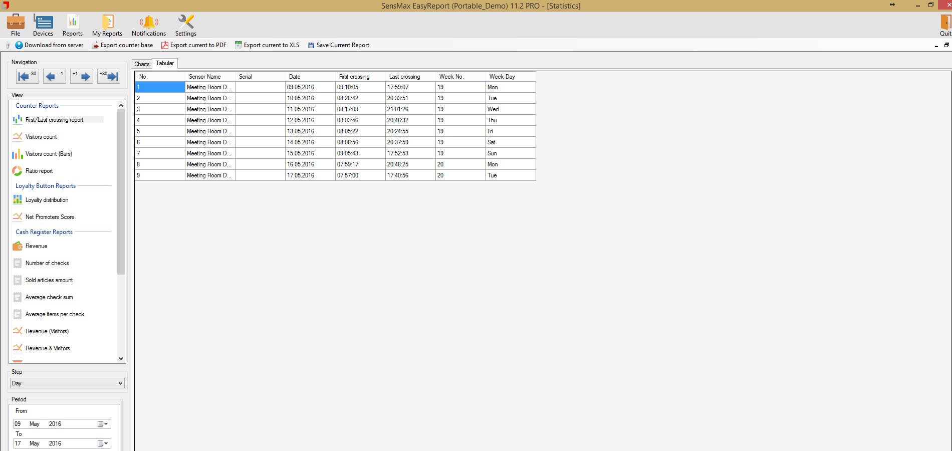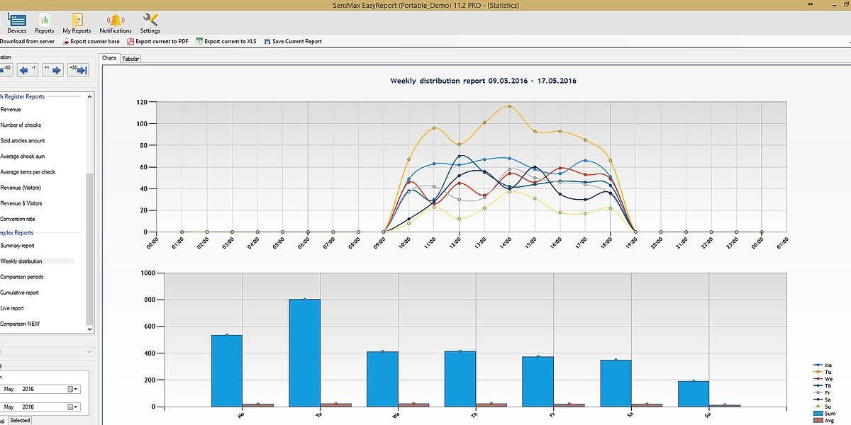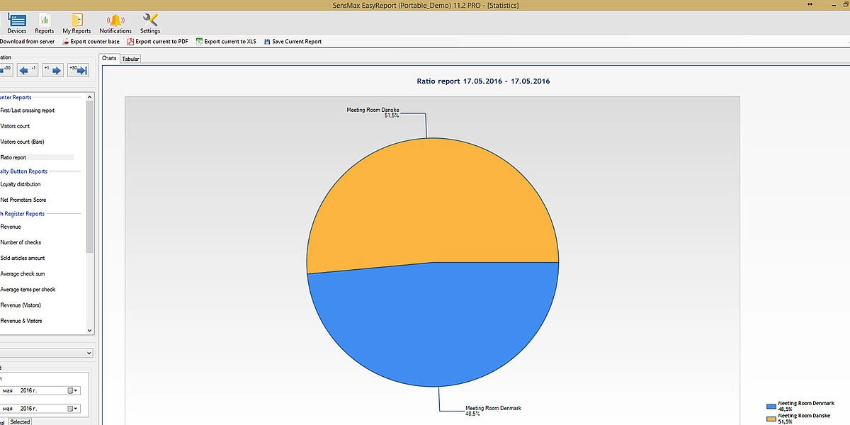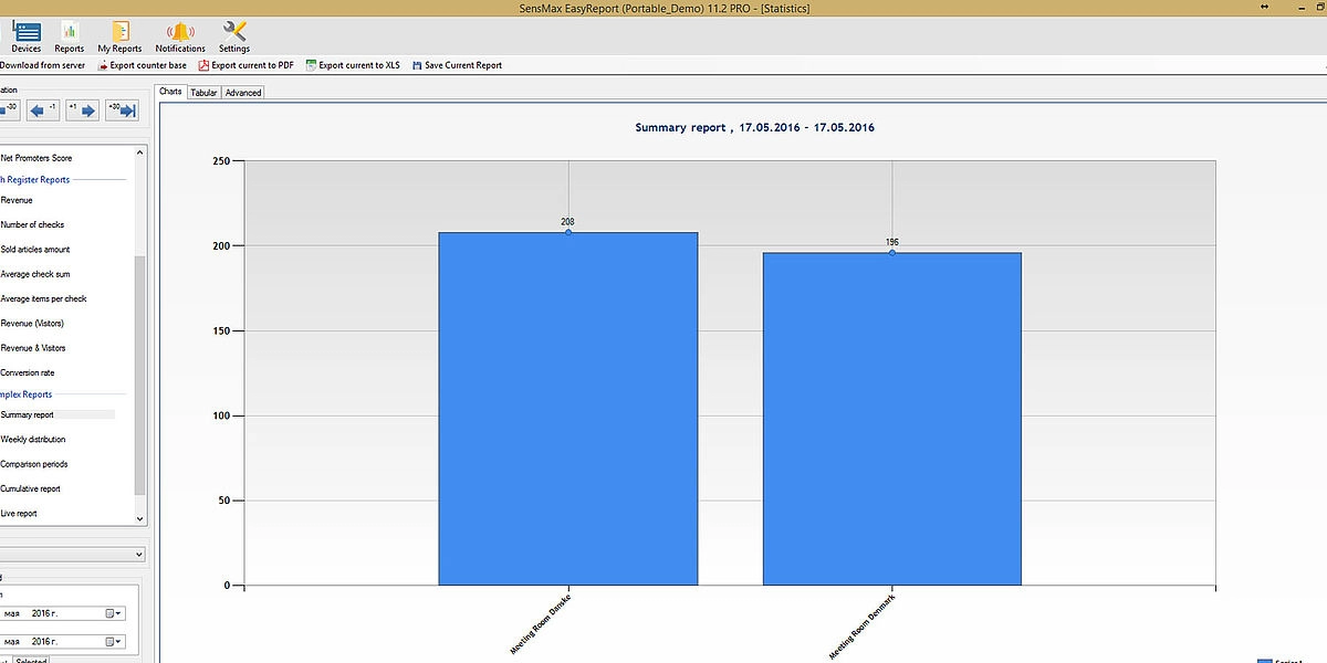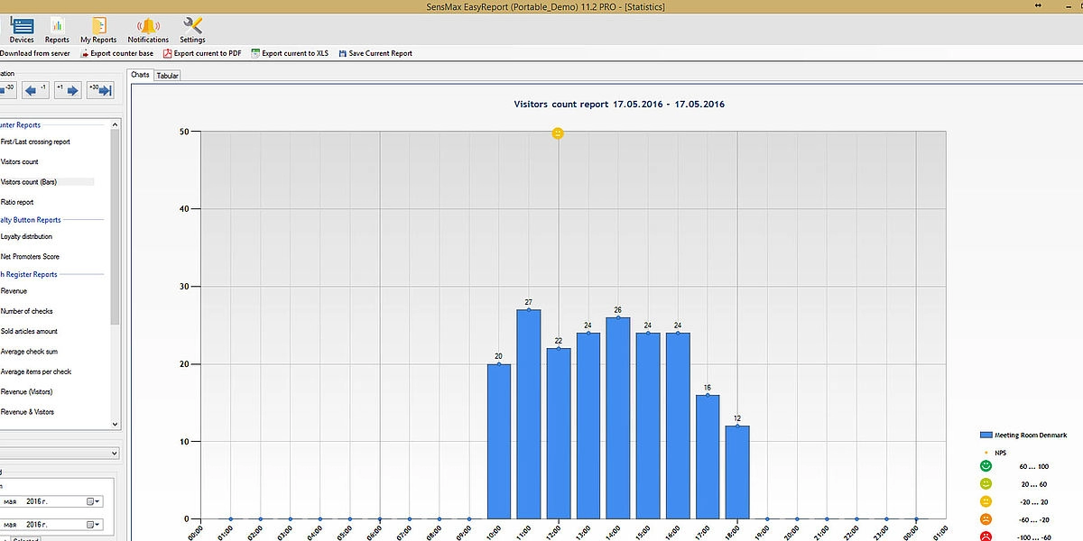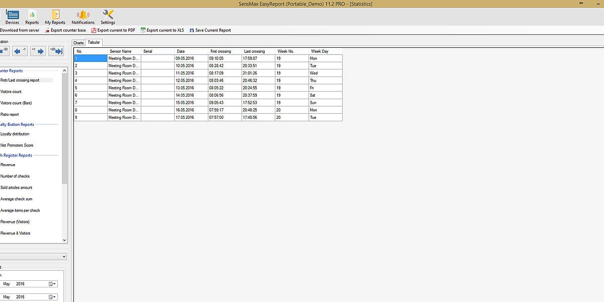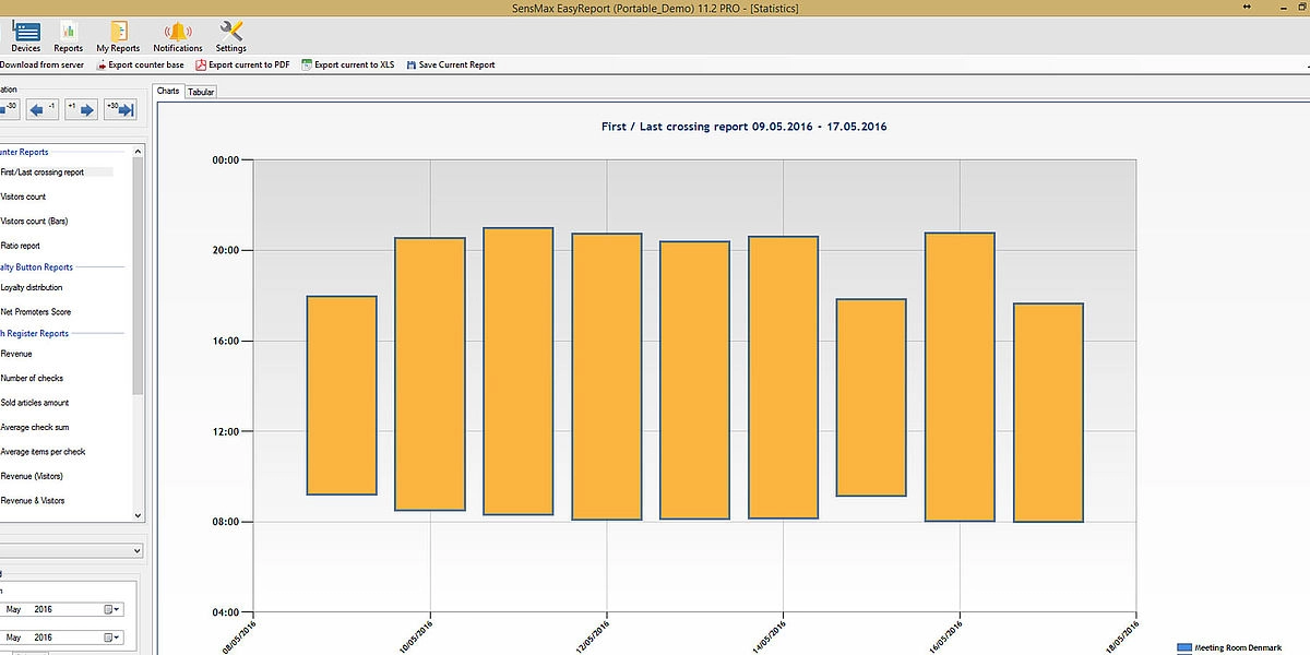 A valós idejű látogatószámlálókból származó statisztikai adatokat 5 perces időközönként statisztikai, analitikai és adminisztratív jelentésekben jelenítik meg. Lehetőség van a jelentések megtekintésére a felhőalapú jelentéskészítő portálon, vagy a jelentéskészítő szoftver telepítésére egy helyi szerverre. A felhőalapú jelentéskészítő portál lehetővé teszi az adatok exportálását API-n keresztül, vagy lehetőség van az adatok közvetlen exportálására az eszközökről MQTT-n keresztül a harmadik féltől származó jelentéskészítő rendszerekbe, például épületfelügyeleti rendszerbe történő egyszerű integráció érdekében. A jelentéskészítő szoftver megjeleníti a látogatási trendeket és a konferenciatermek foglaltsági statisztikáit, amelyek hasznosak az irodaterület-kihasználtság optimalizálásához.