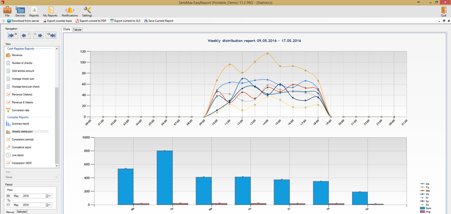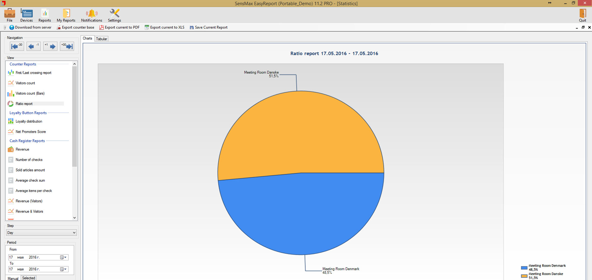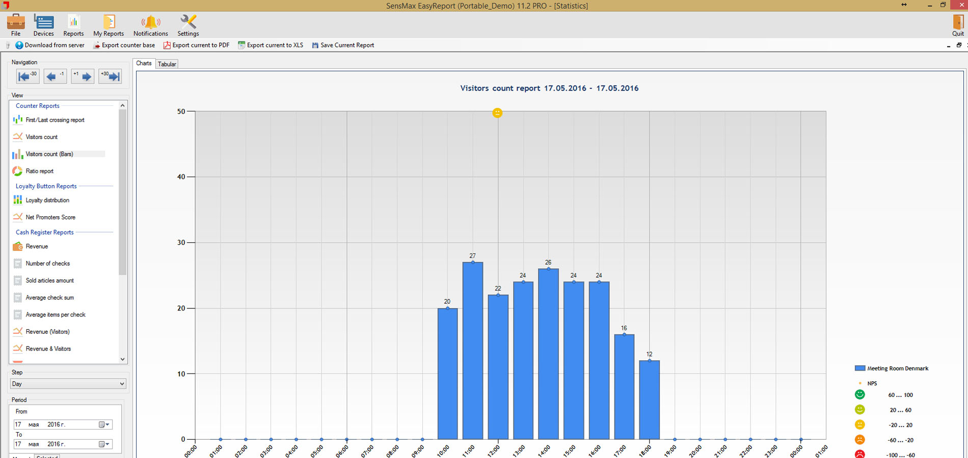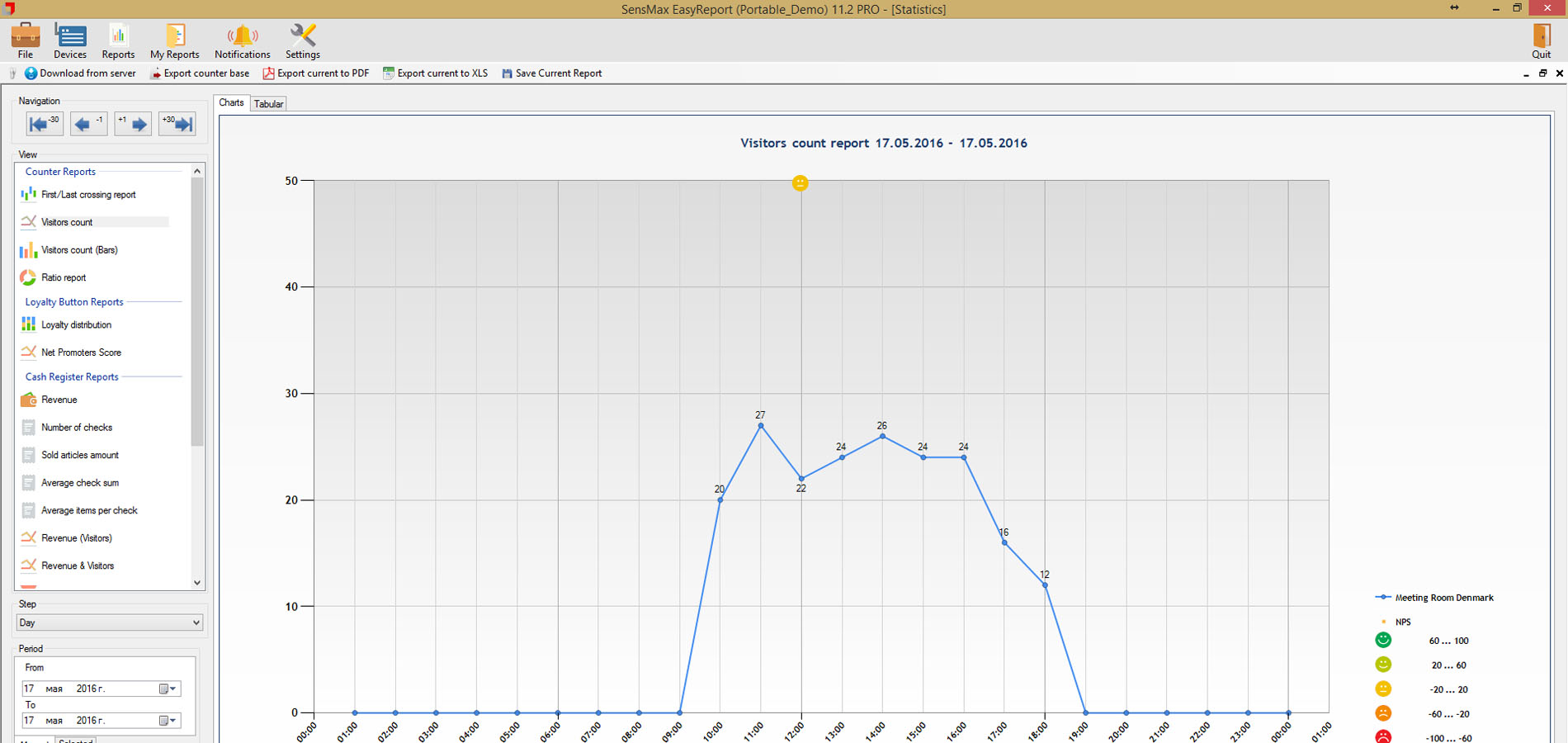 A valós idejű látogatószámlálókból származó statisztikai adatokat 5 perces időközönként statisztikai, analitikai és adminisztratív jelentésekben jelenítik meg. Lehetőség van a jelentések megtekintésére a felhőalapú jelentéskészítő portálon, vagy a jelentéskészítő szoftver telepítésére egy helyi szerverre. A felhőalapú jelentéskészítő portál lehetővé teszi az adatok exportálását API-n keresztül, vagy lehetőség van az adatok közvetlen exportálására az eszközökről MQTT-n keresztül a harmadik féltől származó jelentéskészítő rendszerekbe, például épületfelügyeleti rendszerbe történő egyszerű integráció érdekében. A jelentéskészítő szoftver megjeleníti a látogatási trendeket és a konferenciatermek foglaltsági statisztikáit, amelyek hasznosak az irodaterület-kihasználtság optimalizálásához.