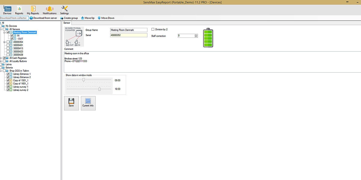 A konferenciatermekhez való vezeték nélküli személyszámláló érzékelők valós időben juttatják el a statisztikákat egy központi szerverre. A látogatószámláló érzékelők képesek érzékelni a látogatók BE vagy KI mozgási irányát. Ez lehetővé teszi a tárgyalótermek tényleges foglaltságának ellenőrzését. A vezeték nélküli személyszámlálók elemmel működő eszközök, amelyek szabványos AA elemekkel akár 1 évig is működnek. A valós idejű SensMax SMX TS adatátjáró akár 20 darab látogatószámláló érzékelőtől is leolvassa a statisztikákat akár 800 méteres hatótávolságban, és LAN/Internet vagy WiFi internetkapcsolaton keresztül tölti fel azokat a szerverre.