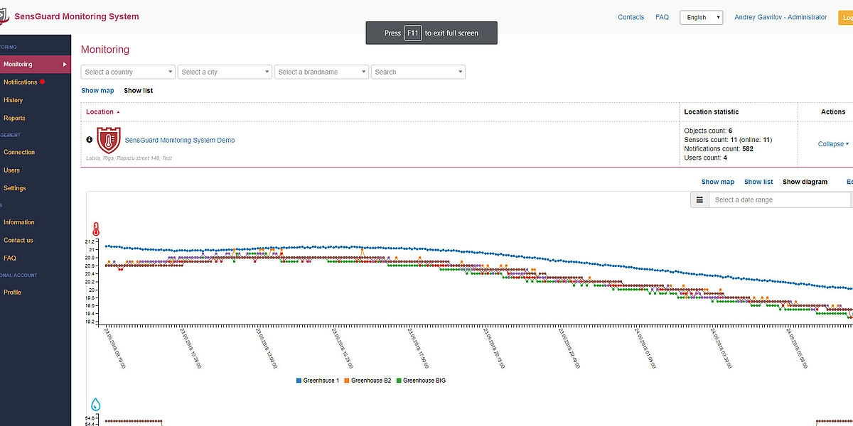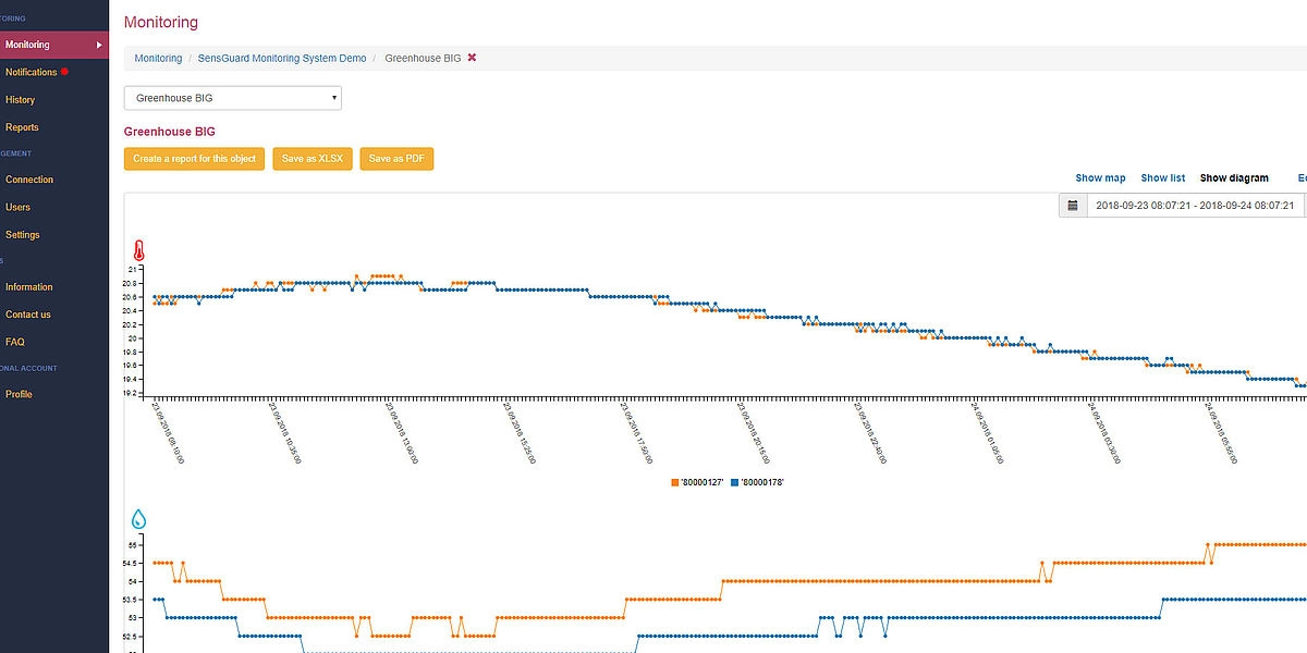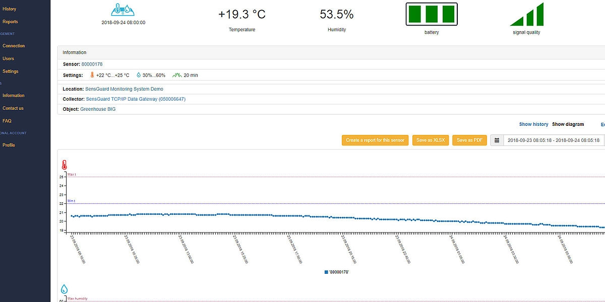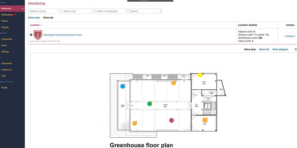 A SensMax hőmérséklet- és páratartalom-felügyeleti rendszert kínál a termelékenység javítására és a növényveszteség elkerülésére az üvegházakban a hőmérséklet és a páratartalom helytelen keverékéből adódó betegségek esetén. Az üvegházak megfelelő környezeti feltételeket igényelnek. Ezért a hőmérséklet és a páratartalom monitorozása és szabályozása elengedhetetlen a növények optimális növekedéséhez és a betegségek megelőzéséhez. A vezeték nélküli üvegház-hőmérséklet-felügyeleti rendszer lehetővé teszi az üvegházak hőmérséklet- és páratartalom-szintjének nyomon követését. A rendszer 24/7-ben figyeli a környezeti feltételeket, és riasztásokat küld, ha a beállított hőmérsékleti és páratartalmi feltételek kiesnek az optimális tartományokból. Online nyomon követheti az ökológiai paraméterek változásainak előzményeit.