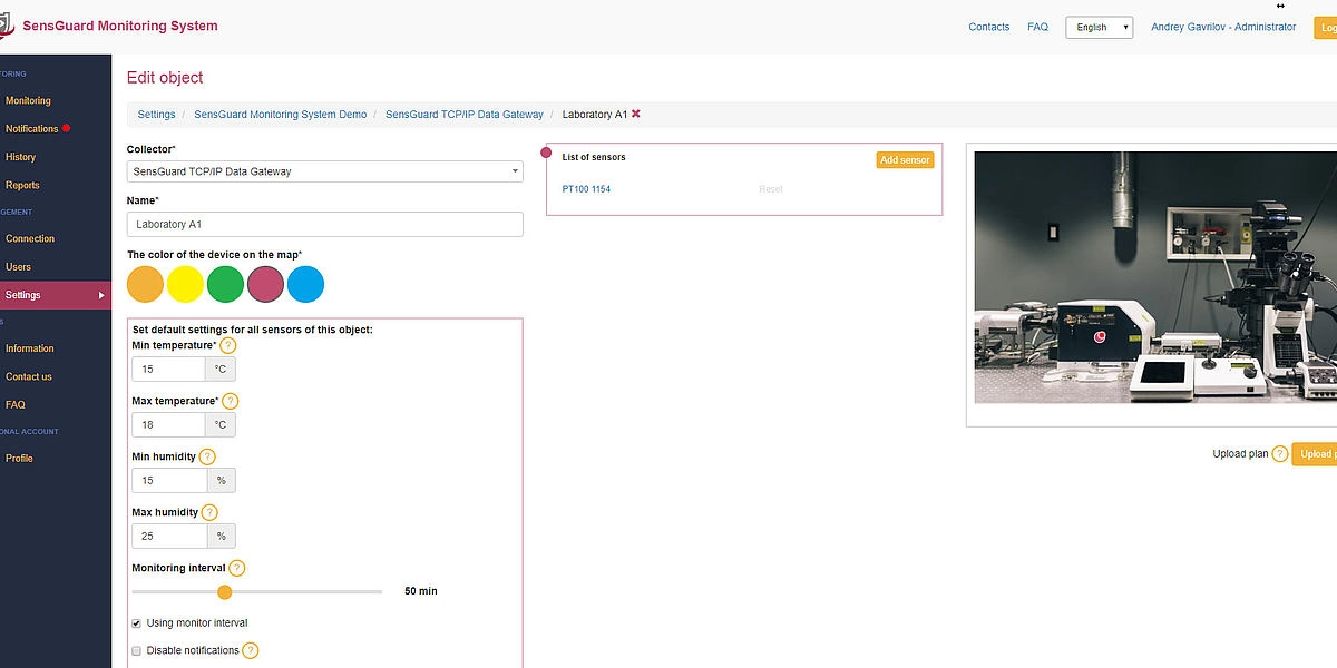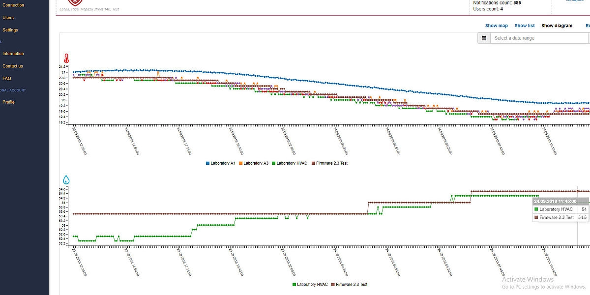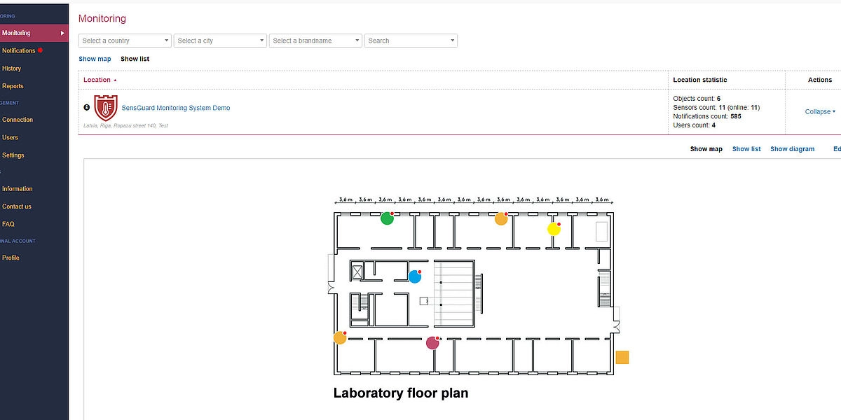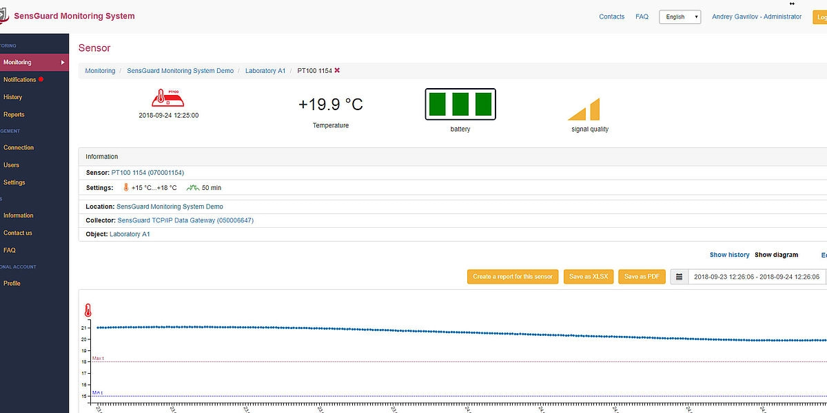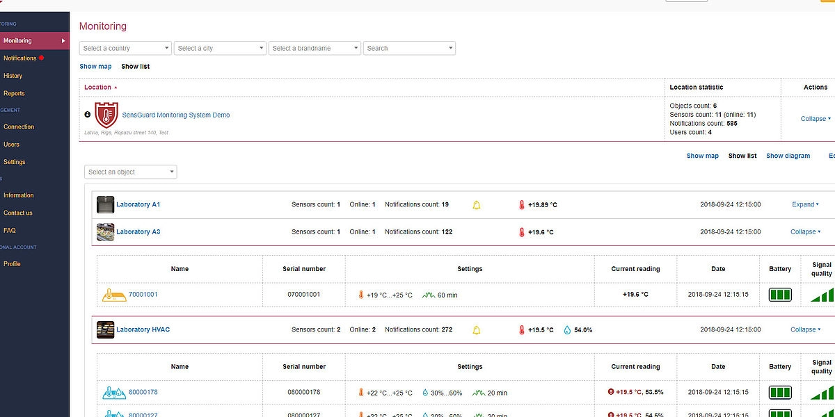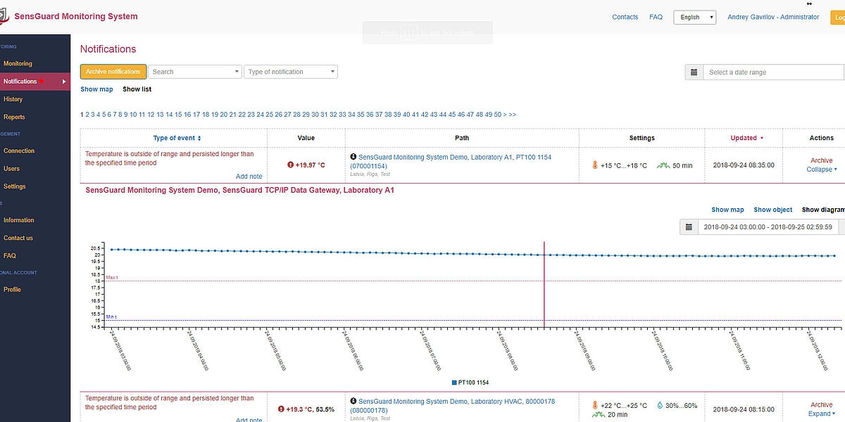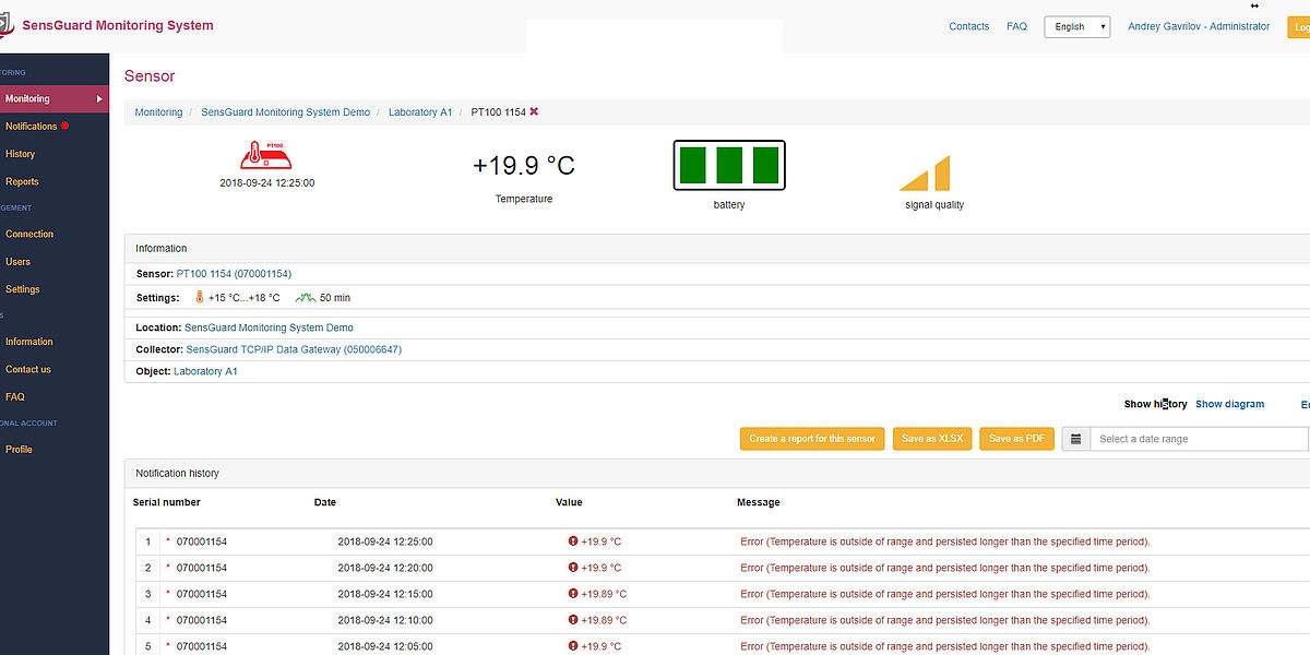 A hőmérséklet-érzékelőkből származó statisztikai adatok 5 perces időközönként kerülnek feldolgozásra az online jelentéskészítő portálon. Ellenőrizheti az egyes hőmérséklet-érzékelők aktuális leolvasásait, valamint bármely időszakra vonatkozó előzményadatokat. Lehetőség van e-mailes vagy Telegram SMS-értesítések fogadására, ha a hőmérséklet vagy a páratartalom túllépte a meghatározott tartományt.